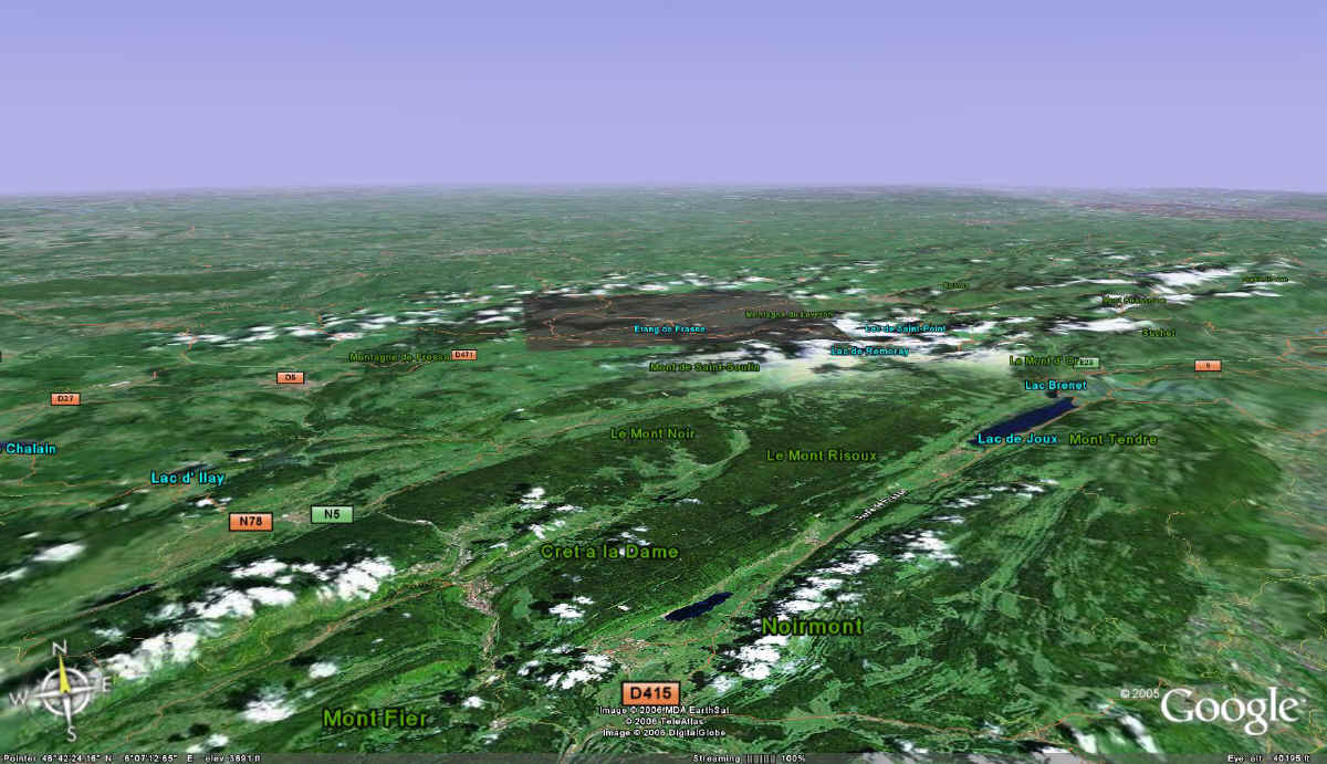 lesrousses01 la forêt du Mont Noir (à gauche)- la forêt du Risoux - la Vallée de Joux - la Suisse à droite (Copyright_Google)