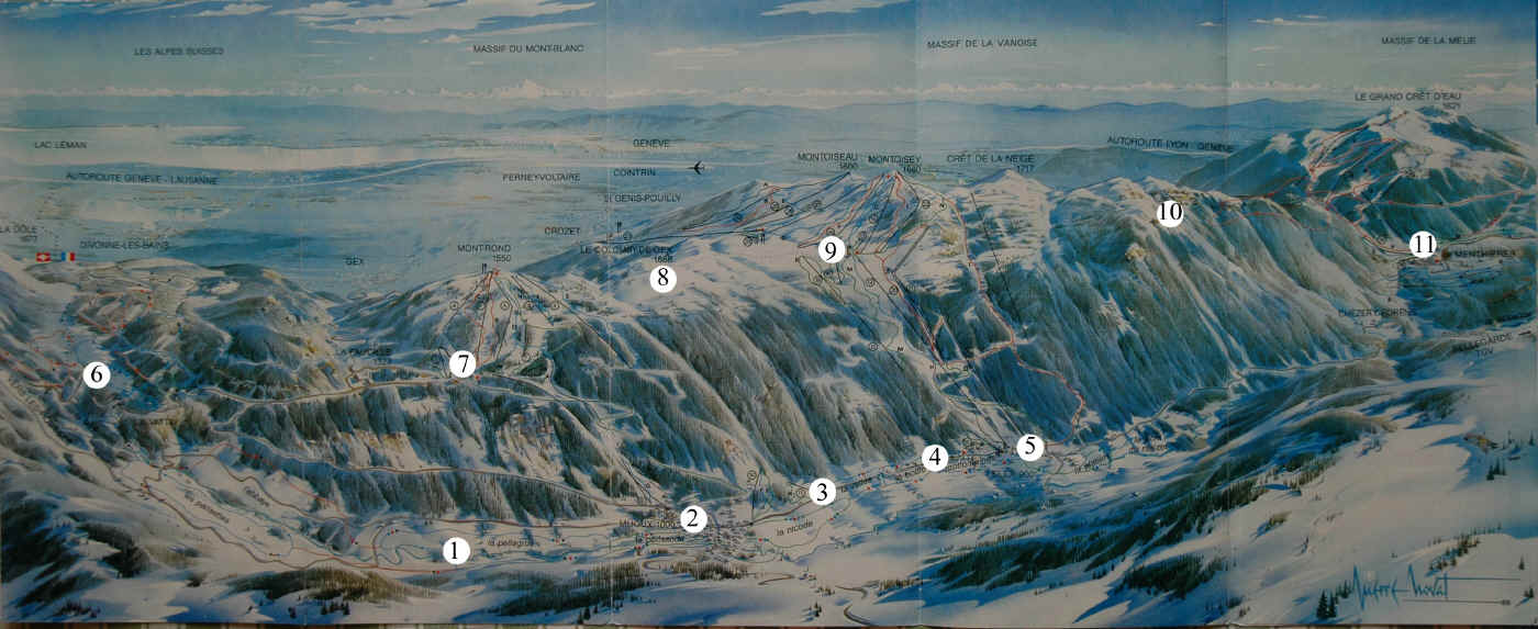 cliquez sur la zone qui vous intéresse) haut jura sud la Vattay (6) -la station de ski du col de la Faucille (7) - le Mont-Rond - le Colomby de Gex (8)- la station de ski de Lélex (9) - le crêt de la Neige (10) - Menthières (11). |